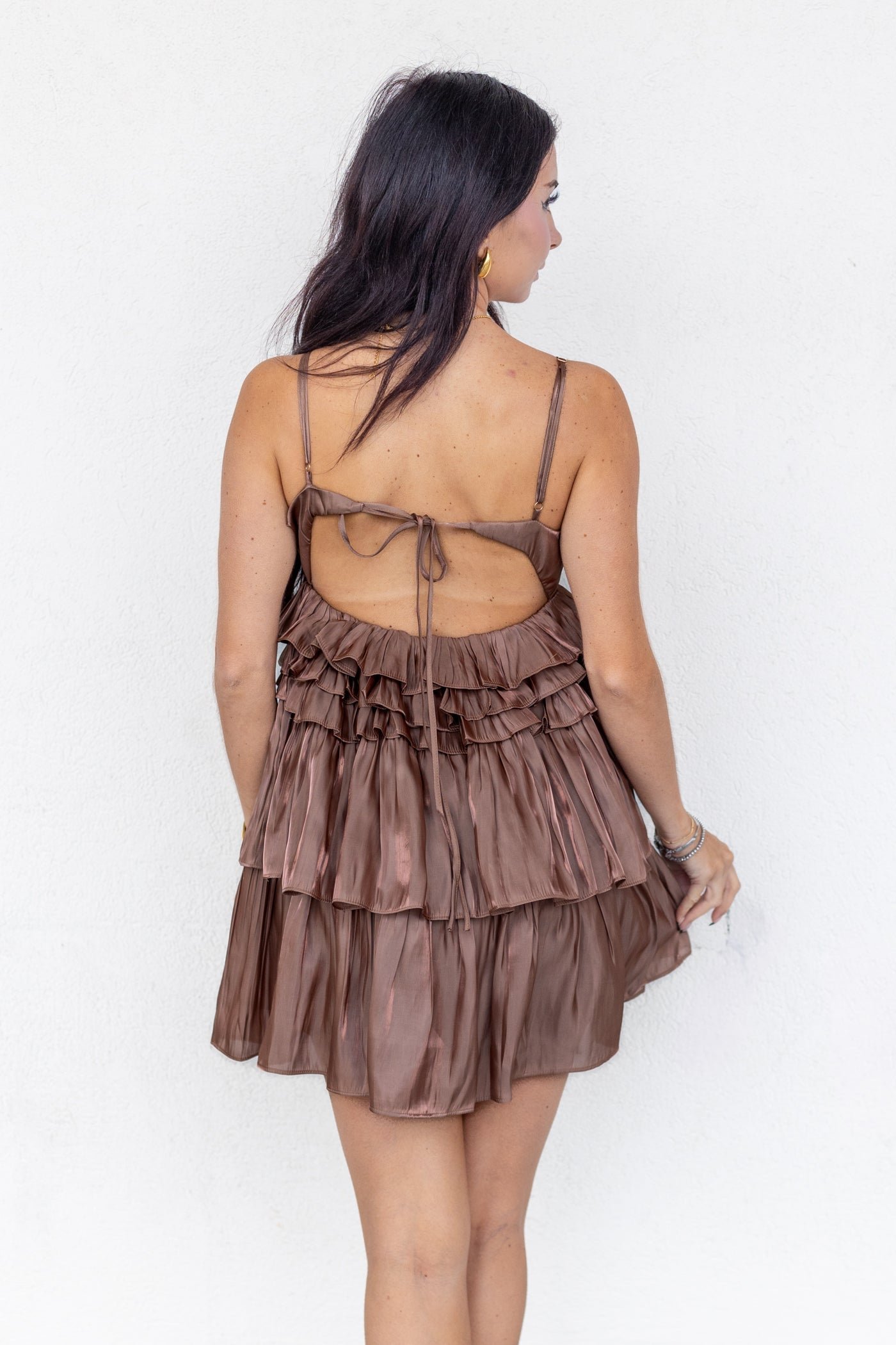 BROWN SATIN RUFFLE DRESS